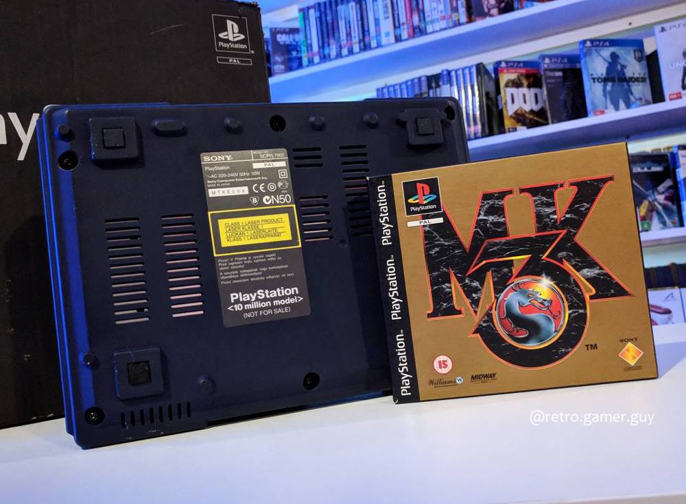 To musi być PSX 10 Million Edition . Jeden z zaledwie 300 na świecie, które zostały rozdane jako nagrody w celu upamiętnienia sprzedaży 10 milionów sztuk. Moja konkretna sztuka została wygrana przez młodego dzieciaka w Południowej Afryce w latach 90-tych. Zajął drugie miejsce w konkursie Mortal Kombat 3 w swoim lokalnym centrum handlowym.