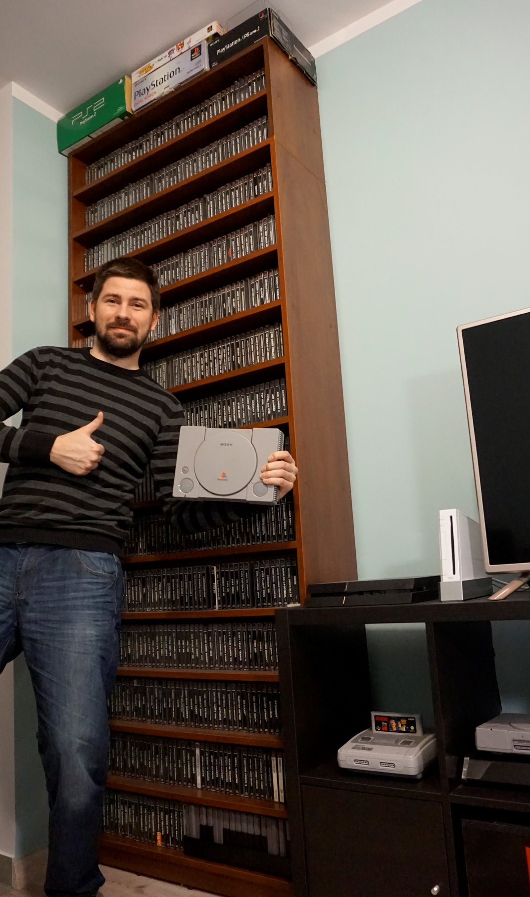 Moją główną kolekcjonerską drogą są gry na pierwsze PlayStation – w dzieciństwie marzyłem o tym, aby mieć kiedyś dużo gier na pleja, aby móc dowolnie dobierać tytuły zależnie od humoru – wydaje mi się, że marzenie udało się spełnić, bo myślałem bardziej o ilościach rzędu 20-30 tytułów 🙂