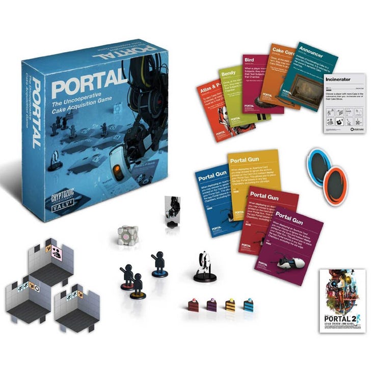 Tym razem planszówka na podstawie logiczno-platformowej gry fpp od Valve dająca możliwość powrotu do Aperture Laboratories. Gra polega na nieustannej kontroli tego co dzieje się na planszy, gracze używając portali, przenoszą swoje przedmioty testowe do różnych komór w laboratorium. Pod koniec tury każdego gracza jedna z komór na końcu laboratorium ulega zniszczeniu, zabierając ze sobą wszystkie obiekty, które się w niej znajdowały. Sprawy nie ułatwia fakt, że mamy tutaj do czynienia z rywalizacją między graczami i tak przeciwnicy mogą podnieść twoje ciasto i przesunąć je bliżej przepaści. Wygrywa ten, kto zdobędzie najwięcej tortów, gdy drużyna straci ostatniego badanego.