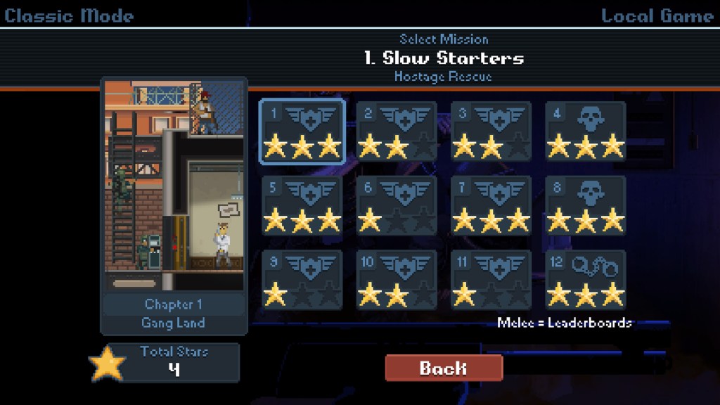 Po przejściu każdej misji widzimy statystyki takie jak czas przejścia, ilość zabitych czy własnych zgonów oraz dostajemy punkty doświadczenia oraz ogólną ocenę wyrażoną w postaci gwiazdek. Punkty i gwiazdki możemy przeznaczyć na rozwój naszej postaci, co z kolei przekłada się na nasza skuteczność podczas kolejnych misji. Jak wspomniałem w grze prócz standardowego strzelania do wszystkiego co się rusza, mamy też inne cele misji, powoduje to, że gra staje się bardziej taktyczna i wymusza na nas planowanie kolejnych kroków bo nieziemsko łatwo jest tutaj zabić zakładnika czy zginąć samemu jeśli źle ocenimy sytuację.