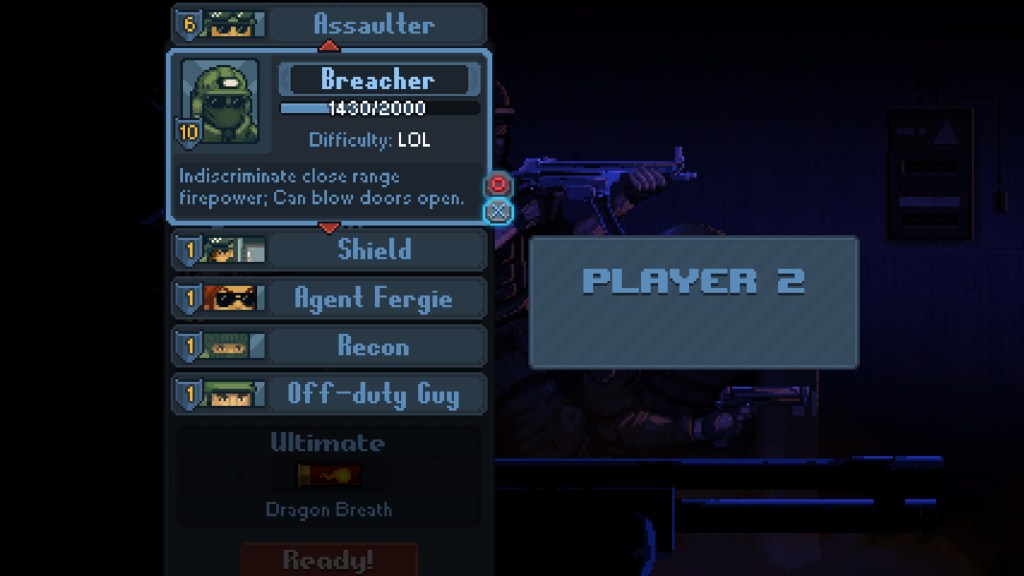 Podobieństwa do produkcji od Devolver Digital jednak szybko znikają z pierwszego planu wraz z odpaleniem gry. W Door Kickers: Action Squad przyjdzie nam poprowadzić oddział SWAT, którego zadaniem jest eliminowanie przestępców. Piszę to oczywiście w sporym uproszczeniu bo wierzcie mi, że byłem naprawdę zaskoczony jak sporo zawartości udało się upchnąć w grę która waży zalewie 72 MB. Do naszej dyspozycji oddano 6 grywalnych postaci których każda posiada swój własny arsenał broni i umiejętności. Jest tutaj min. Assaulter, specjalizujący się w karabinach maszynowych; Agent Fergie, która upodobała sobie broń krótką i nóż; Recon, eliminujący przestępców w ciszy czy mój aktualny ulubieniec – Breacher, posługujący się shootgunami, mówię Wam, nic tak nie cieszy jak wywalenie drzwi strzelbą i posłanie ściany kul w stojących za nimi przeciwników.