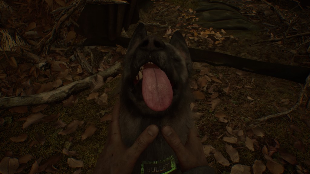 Aby ułatwić nam nieco bezpieczną eksplorację tego przeklętego, do naszej dyspozycji mamy min. latarkę, kamerę video (jak w serii Outlast), telefon komórkowy, krótkofalówkę czy wspomnianego wcześniej Bulleta. Zanim wyjaśnię, po co i na co nam te wszystkie przedmioty to skupmy się na chwilę na naszym czworonożnym przyjacielu, bo odgrywa on niemałą rolę, zarówno w grze jak i w życiu Ellisa. Bullet jest częściowo naszym przewodnikiem, potrafi tropić po powąchaniu jakiegoś przedmiotu, pomaga w wykrywaniu niebezpieczeństwa, znajduje wskazówki oraz przynosi nam rzeczy do których nasz bohater nie miałby fizycznej możliwości się dostać. Oprócz samego wykorzystania naszego psiaka jako multitoola, możemy wchodzić z nim w interakcję poprzez karcenie, głaskanie, proste komendy czy rzucenie smakołyku. Tak jak wspomniałem, Bullet jest nie tylko pomocnikiem w pchaniu historii do przodu ale też pomaga utrzymać się naszemu gierojowi w jednym kawałku, bo gdy ten oddali się od swojego kompana na zbyt dużą odległość, zaczyna tracić zmysły. Muszę przyznać, że twórcy naprawdę dali radę w tej kwestii i fajnie, że postać psiaka nie jest tutaj wrzucona na siłę.