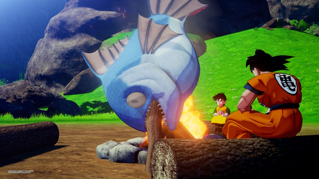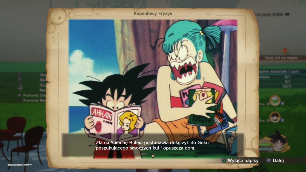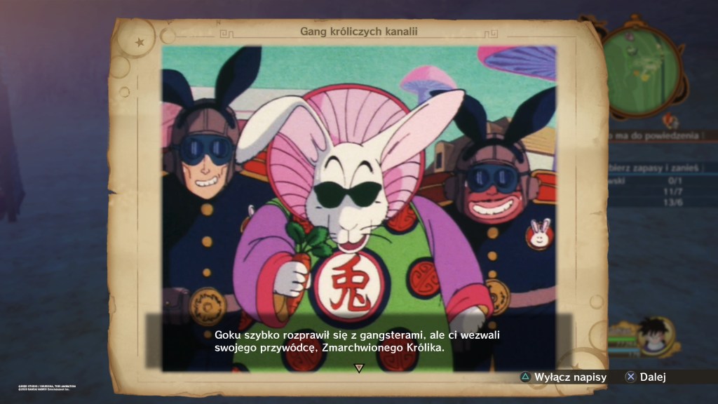 Rozbudowany świat byłby oczywiście niczym gdyby nie jego zawartość i w tym przypadku gra nie zawodzi. W każdej z miejscówek znajdziemy masę itemów do zebrania, jak jedzenie, kule Z, części i kruszce do maszyn czy medale D umożliwiające trening nowych technik specjalnych. Świetnym smaczkiem były dla mnie karty, które przedstawiały wydarzenia z poprzedniej serii Dragon Ball, kiedy to Son Goku był jeszcze dzieckiem.