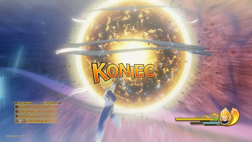 Na koniec, mięso czyli WALKA! O ile wspominane przeze mnie losowe pojedynki nie są niczym ekscytującym, tak walki z bossami to już zupełnie inna para kaloszy. Każdy z napotkanych przeciwników ma swój własny (bądź kradziony od naszych bohaterów) wachlarz ataków, których musimy unikać aby nie klepać w matę. Walczyć możemy solo jak i w drużynie (którą w danych momentach gry możemy sobie sami skomponować z dostępnych postaci), w tej drugie opcji AI przejmuje kontrolę nad naszymi towarzyszami, a nam pozwala na wywołanie asysty w formie ataku specjalnego. Sam system walki jest dość prosty i opiera się o szybkie uniki, blok, ataki wręcz, KI i specjalne – wszystko przy pomocy jednego, max dwóch przycisków na raz. Dzięki takiemu rozwiązaniu, pojedynki są niezwykle dynamiczne i efektowne. Kamehameha, Genki-Dama, Galick Gun , Final Flash (przetłumaczone jako Działo Czosnkowe :D) – jest tutaj dosłownie wszystko. Swoją drogą system walki przypominał mi nieco ten znany ze Spidermana czy serii Batman Arkham, co w tym przypadku jest moim zdaniem zaletą bo z jednej strony starcia są satysfakcjonujące, a z drugiej nie pochłaniają całej uwagi gracza i pozwalają cieszyć się historią, którą oglądamy na ekranie.