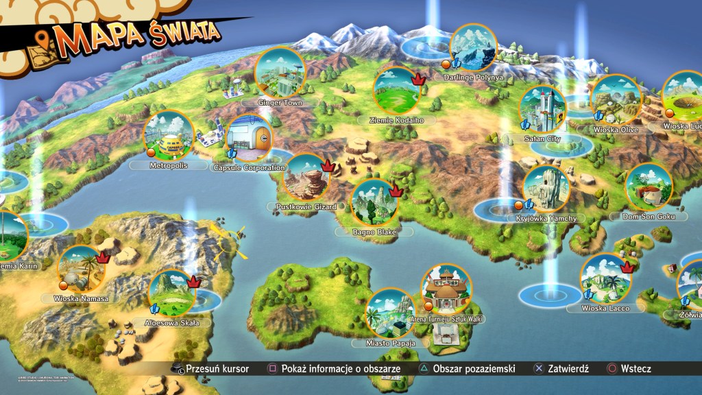 Przejdźmy zatem do samej rozgrywki. Mamy tutaj do czynienia z RPG akcji w otwartym świecie. Nasze postacie (tak postacie!) walczą z wrogami, zbierają przedmioty, zdobywają punkty doświadczenia, poziomy, nowe ataki, umiejętności itp. Wszystko zgodnie ze sztuką, bez większych odstępstw od reguły. Mapa jest dość spora (na tyle, że nawet nie zmieściła mi się na screenie), z wyszczególnionymi punktami do których możemy się udać. Odwiedzimy znane miejscówki jak np. Boski Pałac, Kame House, Dom Son Goku, Capsule Corporation czy nawet planetę Namek! Rozmiar oczywiście cieszy (i w tym wypadku ma znaczenie, badum tss…), jednak wiąże się z nim pewien zgrzyt, mianowicie za każdym razem, kiedy dotrzemy do granicy danego obszaru, gra wywala nas do mapy gdzie po wybraniu miejsca docelowego musimy odczekać swoje, gapiąc się na ekran ładowania.. Niby to tylko chwila itp. ale wierzcie mi, że w przypadku misji gdzie musimy odwiedzić kilka miejsc, staje się to dość upierdliwe (niczym zbyt sztywna metka w koszulce, która po czasie doprowadza Was do szału). Podobno twórcy odpowiedzieli na narzekania graczy i wypuścili patch, który miał nieco przyśpieszyć czas ładowania (nie chcę wiedzieć jak musiało być przed patchem), jednak myślę, że perfekcyjnie byłoby gdyby wzięli oni przykład z ostatniego God of War, gdzie całość z została ukazana na jednym, długim ujęciu.