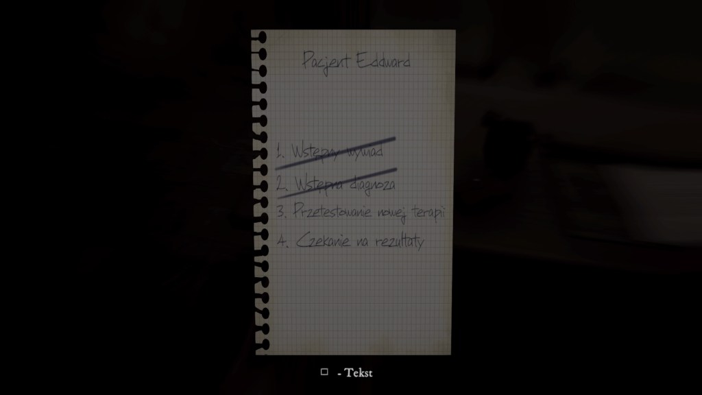 Tak jak w przypadku sporej części wydawanych w ostatnim czasie horrorów, tutaj również mamy do czynienia z grą z perspektywy pierwszej osoby. Sporą część gry spędzimy, przemierzając wspomnianą wcześniej posiadłość jak i zakład psychiatryczny – jednak im dalej tym bardziej surrealistyczne staje i się nasze otoczenie i to co się z nim dzieje. Podczas przeszukiwania kolejnych pomieszczeń, przyjdzie nam rozwiązać kilka zagadek logicznych, które raczej nie stanowią jakiegoś wyzwania, ale wydają się być przemyślane i ciekawie zrealizowane. W grze nie ma teoretycznie bezpośredniego zagrożenia w postaci jakichś monstrów jednak da się tutaj „zginąć”, co skutkuje rozpoczęciem danej lokacji od nowa. Klimat budowany jest głównie przez puste, czasami mroczne lub wykręcone lokacje, drobne jump scary i klimatyczną oprawę dźwiękową i muszę przyznać, że to naprawdę zdało egzamin, bo niejednokrotnie doprowadziło do tego, że dostałem ciarek na plecach, a mój puls był nienaturalnie przyśpieszony.