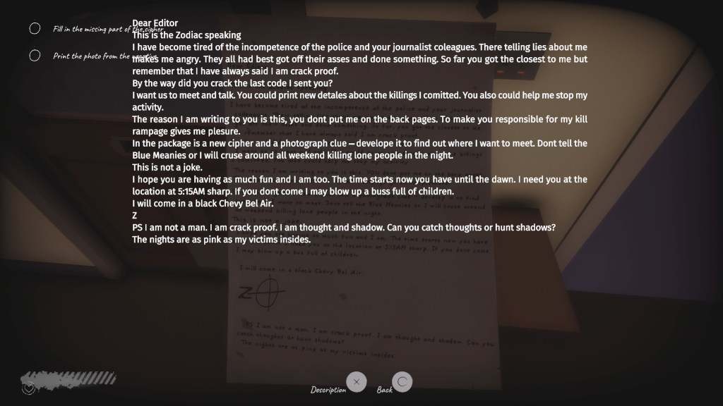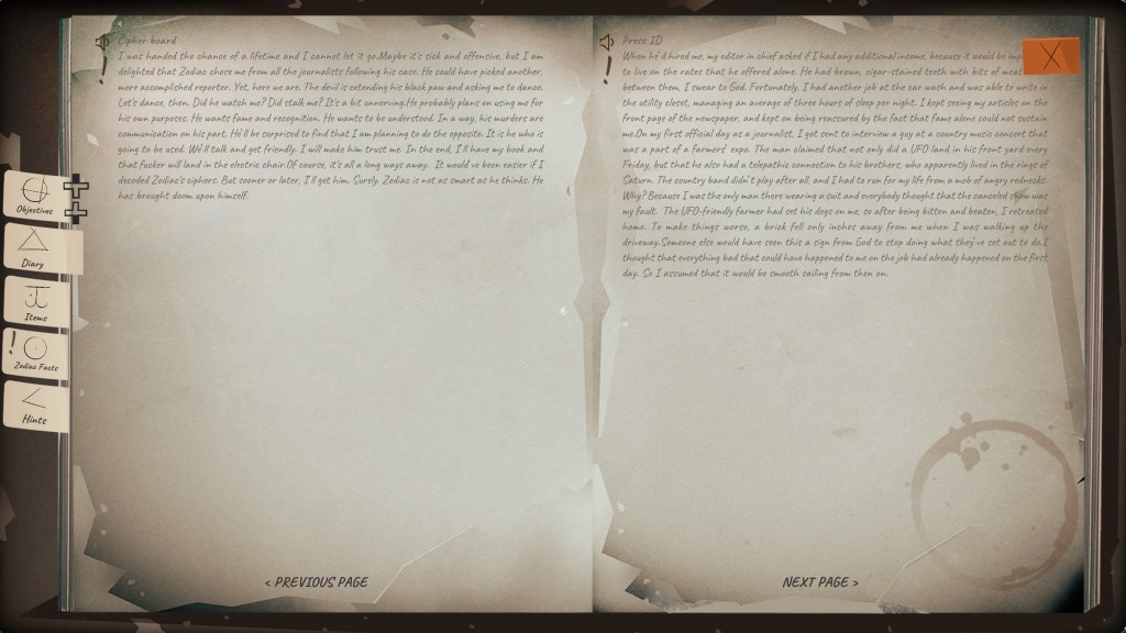 Jako ogromny fan gier przygodowych, horrorów, thrillerów, symulatorów chodzenia i tym podobnych, jestem niestety zawiedziony produktem końcowym, jaki dostarczyło nam Punch Punk Games. Historia Zodiaka niesie za sobą ogromny potencjał na świetną, detektywistyczną, trzymającą w napięciu produkcję, potencjał, który tutaj została zaledwie liźnięty.
