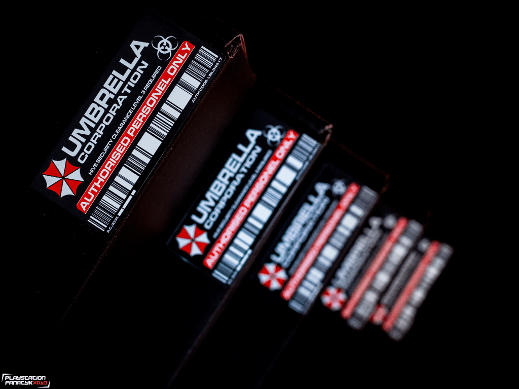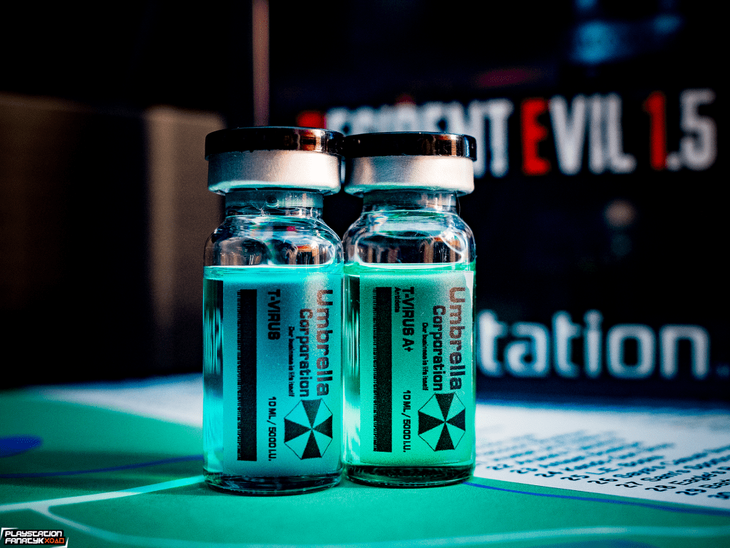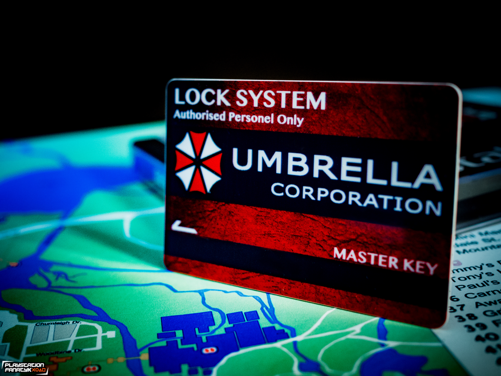 A skoro już jesteśmy przy rzeczach, które kojarzyć się powinno, to nie mogło tu zabraknąć fiolek z Virusem T oraz antidotum, które wykonałem własnoręcznie; karty dostępu Umbrella, wykonanej z PCV; emblematów Raccoon City Department oraz Umbrella Corporation (w formie naszywek).