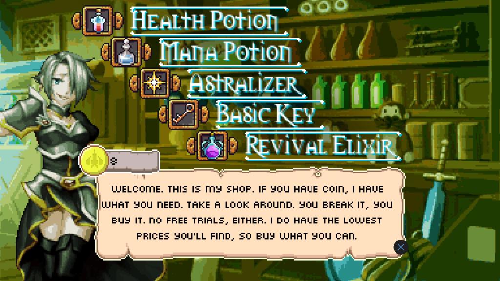 Jako że mamy tutaj domieszkę rpg, to nasza postać może się rozwijać (zdrowie, mana, siła ataku) oraz używać przedmiotów – klasyka. Problem w tym, że w zasadzie trudno wskazać jakąś zależność pomiędzy rozgrywką, a rozwojem postaci. Co do przedmiotów, to możemy kupić je w sklepie znajdującym się w odwiedzanych wioskach/miastach jednak, żeby nie było tak kolorowo, jednocześnie możemy posiadać po jednej sztuce danego przedmiotu.