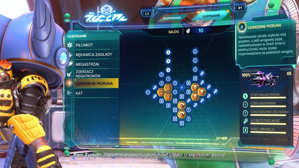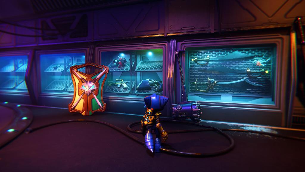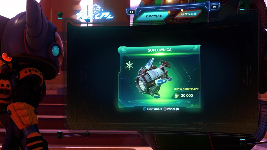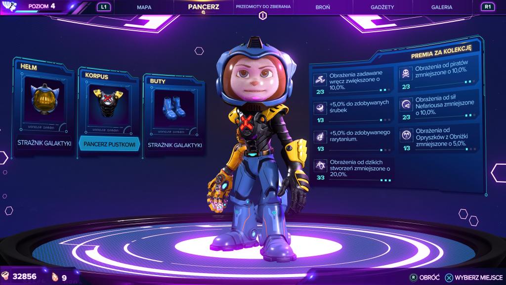 Pozwolicie, że zatrzymam się przez chwilę na arsenale właśnie. Pierwsza, rzecz o której warto powiedzieć, to to, że Ratchet i Rivet dzielą ze sobą cały zdobyty inwentarz (tyczy się to nie tylko broni, ale i zdobywanego pancerza), co pomaga w dopakowaniu kolejnych giwer do maksymalnego poziomu. Grę rozpoczynamy z bronią obuchową oraz Megastrzałem, będącym karabinem plazmowym. Wraz z progresem fabuły, w sklepie Pani Zurokon pojawiają się kolejne pukawki do zakupu jak np. Egzekutor przypominający shootguna; Zderzacz Negatronów, generujący śmiercionośny promień, Zraszacz Roślinogenny zmieniający naszych przeciwników w rośliny; Pan Wojny będąc starą, dobrą wyrzutnią rakiet czy Rękawica Zagłady, która pozwala nam przywołać małych agentów, którzy pomagają nam w walce. Łącznie mamy tutaj jakieś 20 różnych broni, z których każdą możemy ulepszać poprzez zwiększanie jej poziomu (zabijając kolejnych wrogów) do maksymalnie piątego i dokładanie ulepszeń (tu przyda się wspomniane wcześniej Rarytarium) wraz z każdym z nich. Pomimo ogromnego wyboru, szybko znalazłem swój ulubiony set, który dopakowałem pod kurek i którym siałem zniszczenie — jakoś już tak mam, że przyzwyczajam się do jakiegoś uzbrojenia i niechętnie je zmieniam, przez co tak dobrze grało mi się pod tym względem w Ghost of Tsushima czy Assassin’s Creed Valhalla.
