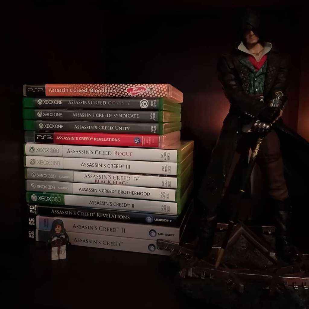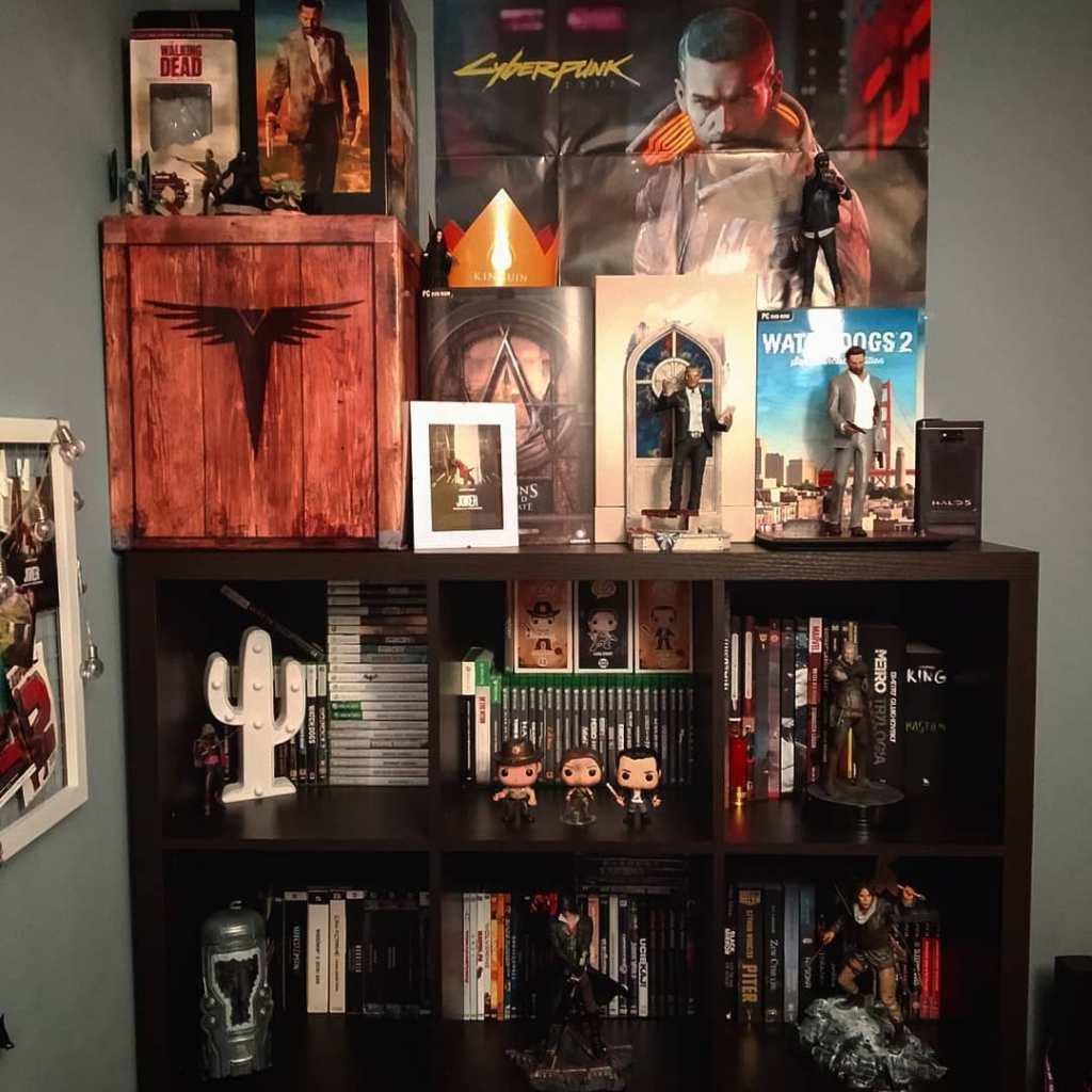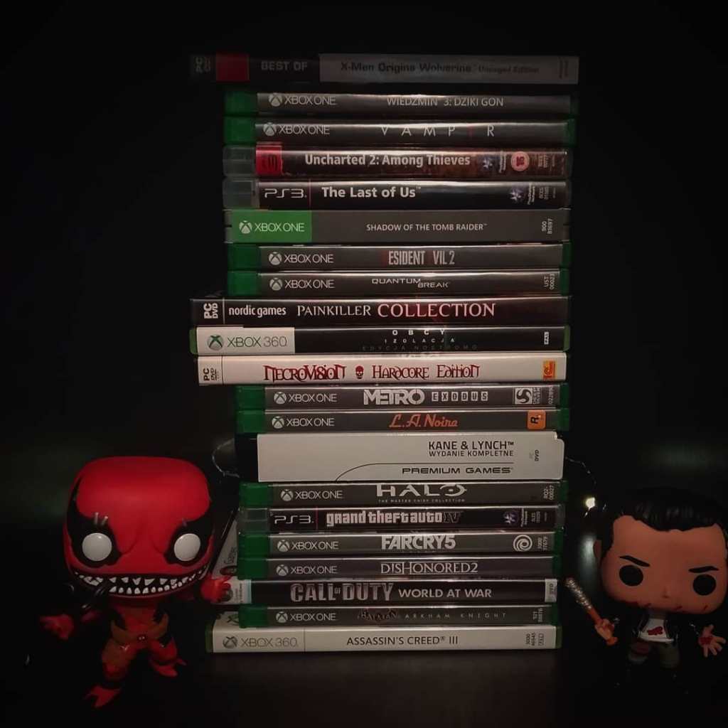 Około 110 pudełek z grami na kilka generacji konsol i 90 pudełek gier na PC (i wspominam tu tylko o grach w wydaniu fizycznym), 6 edycji kolekcjonerskich gier, około setkę książek, 9 figurek Funko POP, 10 figurek innych marek, kilkadziesiąt filmów i seriali na Blu-ray i DVD oraz kilkanaście komiksów 😉