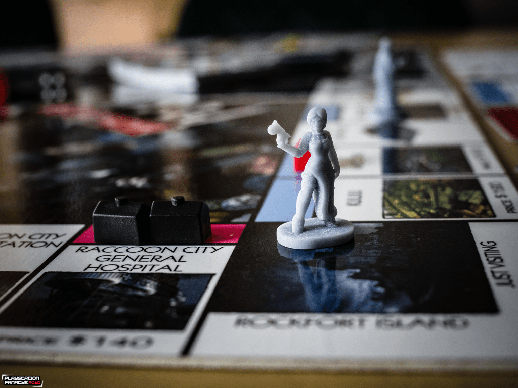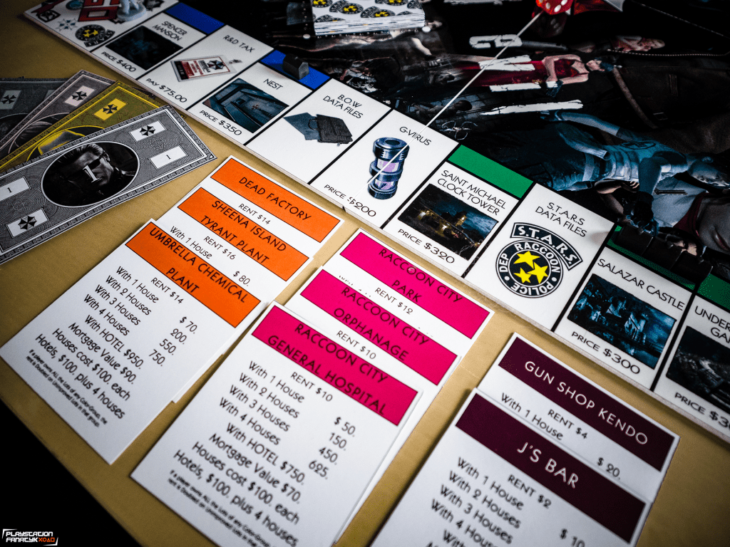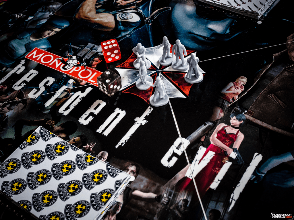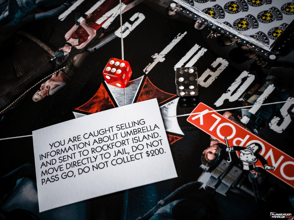 Plansza oczywiście nie mogła być standardowa, tak więc wszystkie pola miejsc zostały podmienione na miejsca i elementy związane z grami z uniwersum RE (tymi klasycznymi jak i mniej znanymi szerszej grupie graczy) , i tak na przykład mamy tu Wyspę Rockfort zamiast więzienia; koleje zastąpiły ikoniczne odmiany wirusów od Umbrelli; Sklep Kendo, Wieża Zegarowa, Zamek Slazara czy Posiadłość Spencera i wiele innych. Całość mierzy 50x50cm i została wykonana w formie laminowanej naklejki na kilkumilimetrowym PCV dzięki czemu nie powinna ulec zniszczeniu przez dłuższy czas.