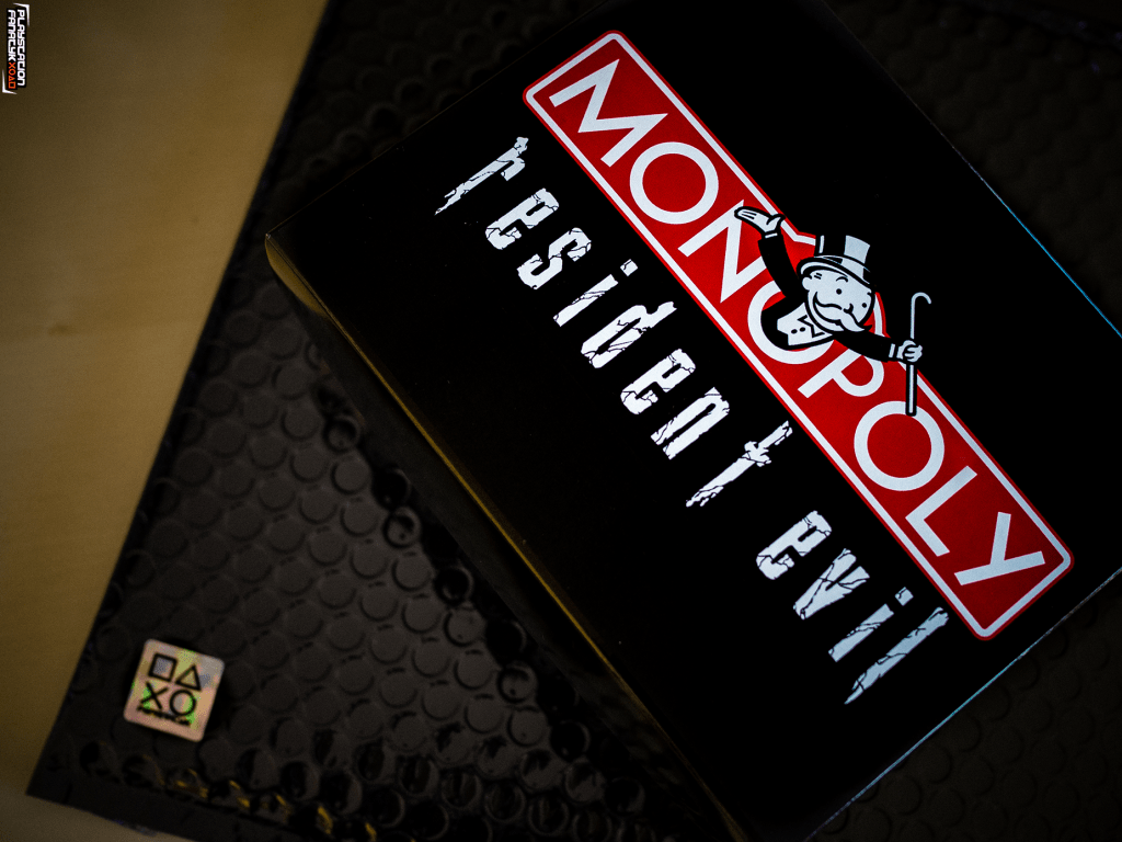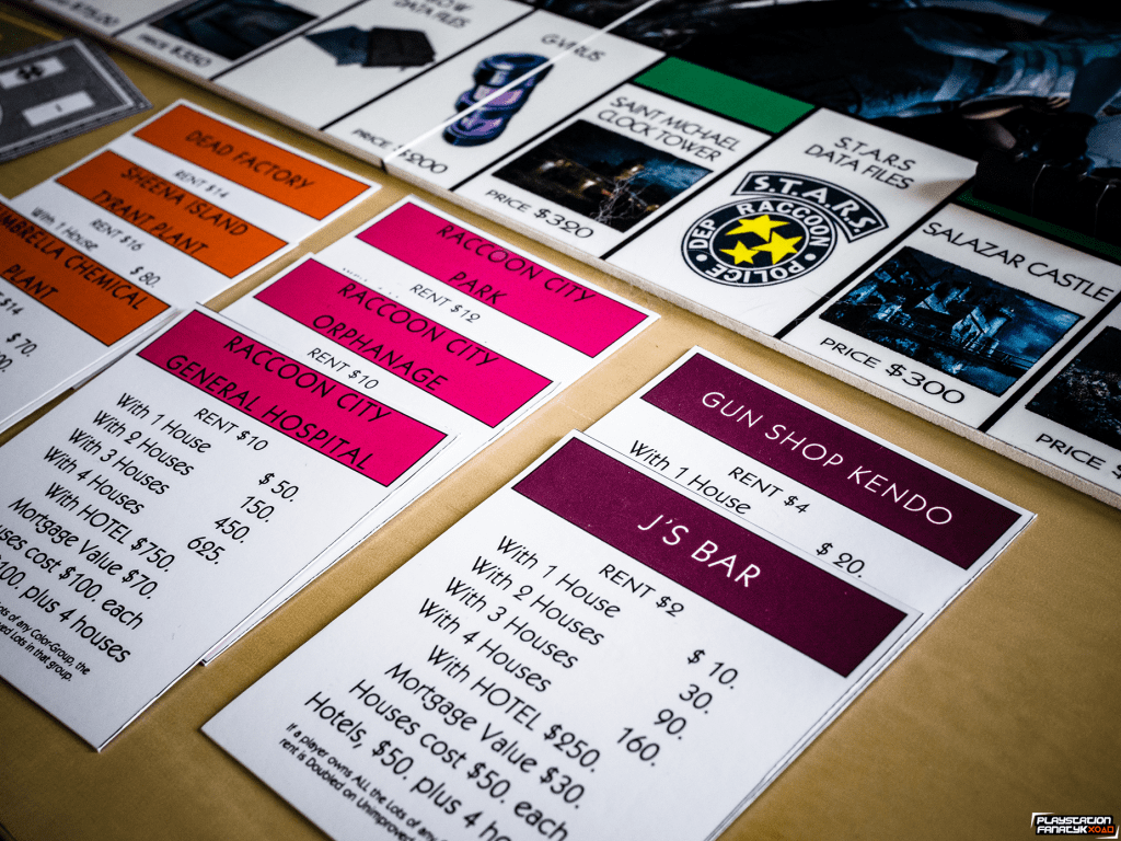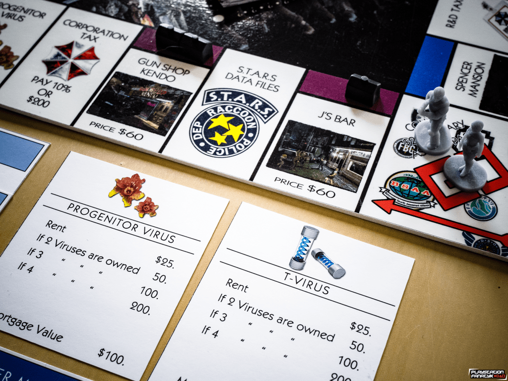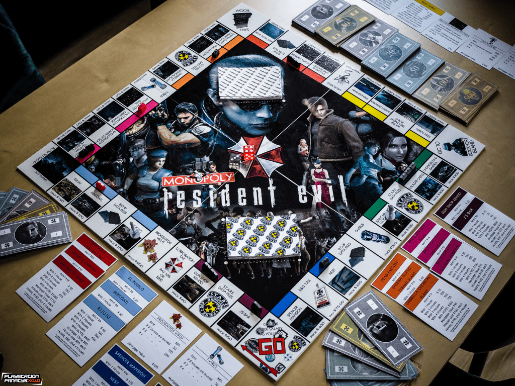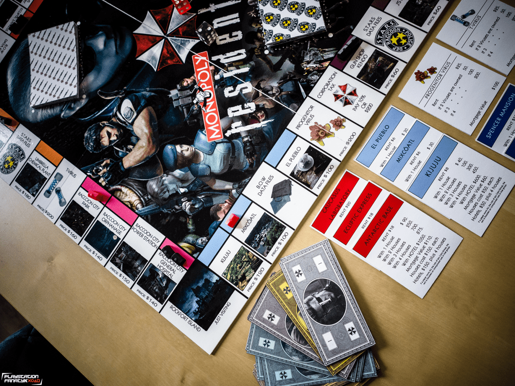 Plansza oczywiście nie mogła być standardowa, tak więc wszystkie pola miejsc zostały podmienione na miejsca i elementy związane z grami z uniwersum RE (tymi klasycznymi jak i mniej znanymi szerszej grupie graczy) , i tak na przykład mamy tu Wyspę Rockfort zamiast więzienia; koleje zastąpiły ikoniczne odmiany wirusów od Umbrelli; Sklep Kendo, Wieża Zegarowa, Zamek Slazara czy Posiadłość Spencera i wiele innych. Całość mierzy 50x50cm i została wykonana w formie laminowanej naklejki na kilkumilimetrowym PCV dzięki czemu nie powinna ulec zniszczeniu przez dłuższy czas.