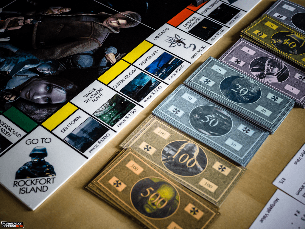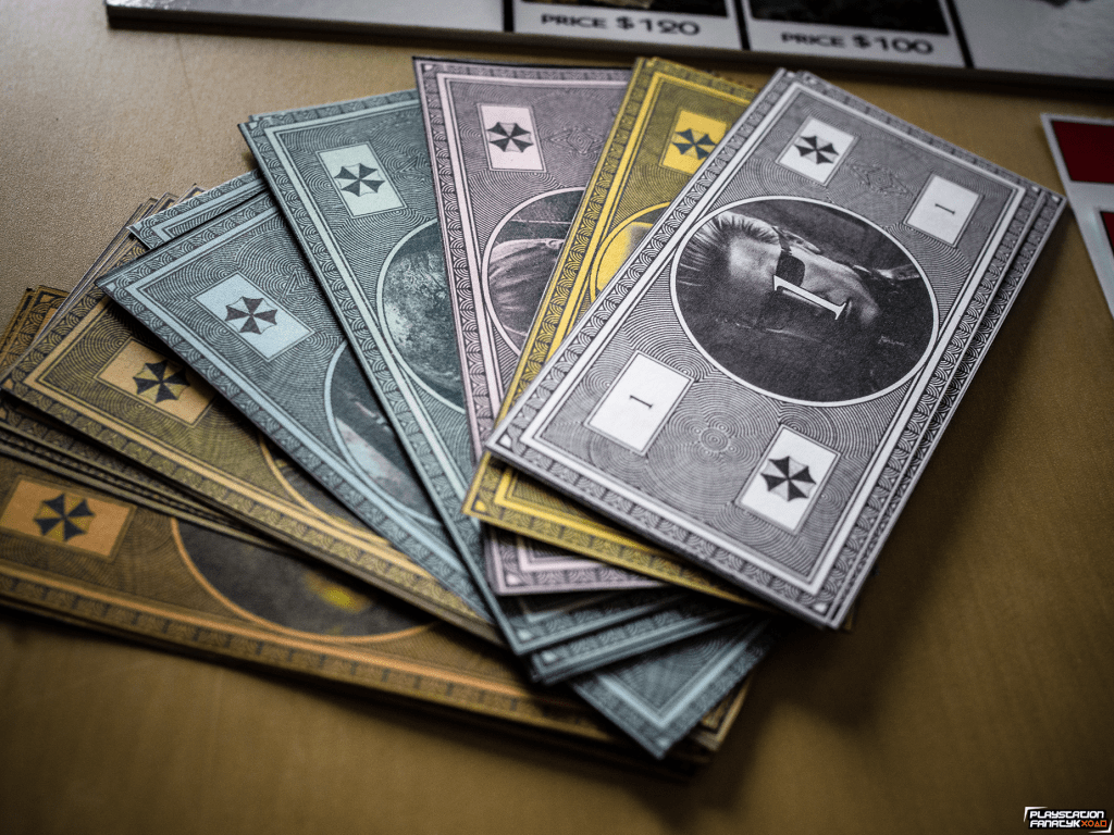 Kiedy miałem już bazę przyszedł czas na skompletowanie elementów do gry. Zaprojektowałem własną walutę, okraszoną między innymi wizerunkiem Weskera, Birkina czy Nemesisa; pionki zostały wydrukowane na drukarce 3D przy użyciu żywicy, przedstawiając co bardziej znane postacie (Leon, Ada Wong, Chris, Wesker, Claire, Jill); karty szans zastąpione zostały danymi B.O.W i S.T.A.R.S; całość dopełniły czerwone i czarne domki/hotele oraz półprzeźroczyste kostki.