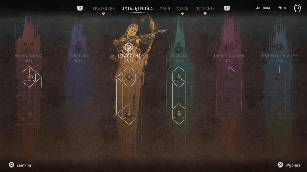 W HZD w pewnym momencie miałem swój „master set”, z którego korzystałem w zasadzie do końca gry (coś w podobie do Assassin’s Creed Valhalla), tu natomiast miałem miejscami wrażanie jakbym grał w loot shooter pokroju Borderlands, gdyż praktycznie co kilka godzin zmieniałem kompletnie mój rynsztunek. Oczywiście sama broń to nie wszystko i tu na plan wchodzi rozwój postaci. Za każde zadanie czy zabicie wroga otrzymujemy punkty doświadczenia, które jak to zwykle bywa, są wymienne na poziomy, a te zaś dorzucają nam nieco zdrowia i kilka punktów umiejętności. Te ostatnie możemy wykorzystać do odblokowywania kolejnych umiejętności (zarówno aktywnych, jak i pasywnych) na 6ciu drzewkach rozwoju, które podzielone są na kategorie (Wojowniczka, Traperka, Łowczyni, Ocalała, Infiltratorka, Mistrzyni maszyn) — tu miałem mały problem, gdyż zdarzało się, że aby odblokować chciany punkt na diagramie, musiałem zakupić po drodze X takich, których pewnie nigdy nawet nie użyłem.