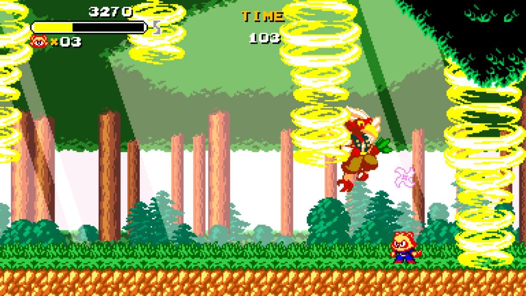 Graficznie chyba nie ma się do czego przyczepić, gdyż biorąc pod uwagę zamiary twórców, którzy postawili na estetykę rodem z lat 80tych/90tych to jest po prostu dobrze. Swoją drogą jak tylko odpaliłem grę, to w moim mózgu doszło do spięcia, które przywołało na myśl Chip ’n Dale Rescue Rangers z NES’a (czy jak kto woli Ekipę RR z Pegazusa). Za świetnym retro-graficznym stylem idzie niczym nieodstająca ścieżka dźwiękowa, która bezbłędnie wpasowuje się w to, co widzimy na ekranie i przywołuje nie mniej wyraźne wspomnienia z czasów żonglowania kartridżami, siedząc pół metra od TV.