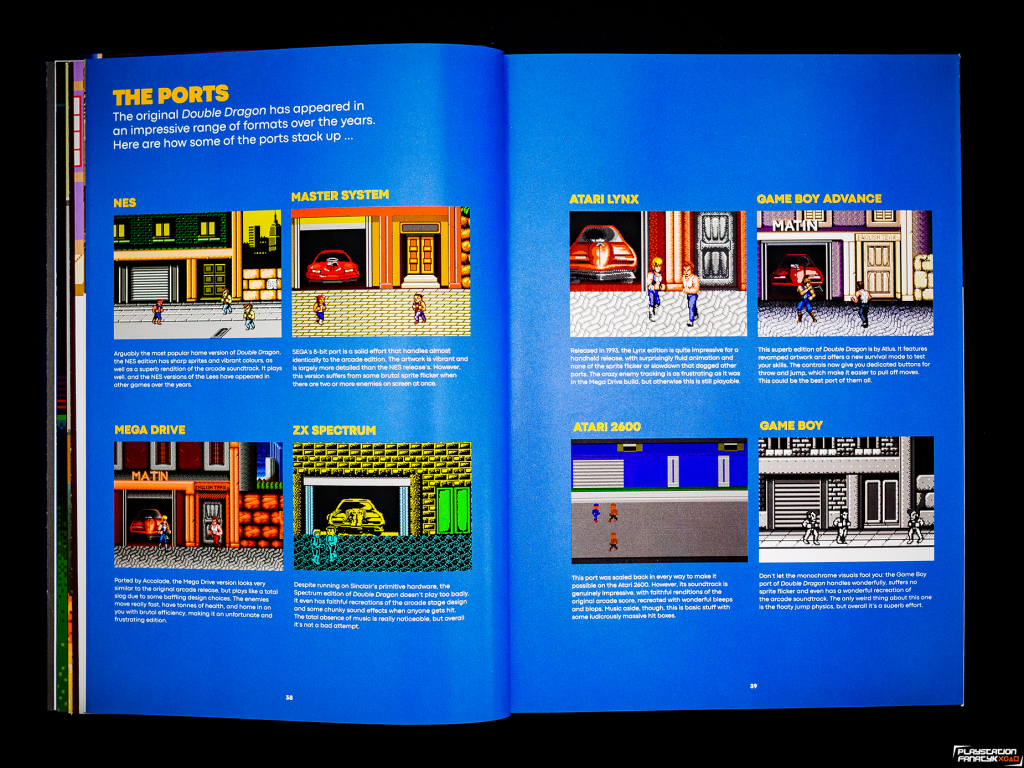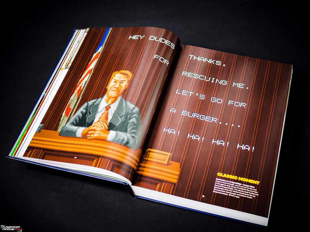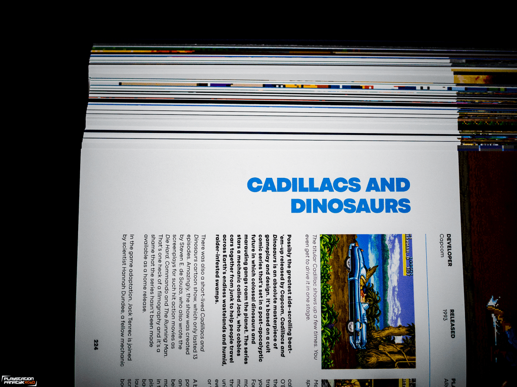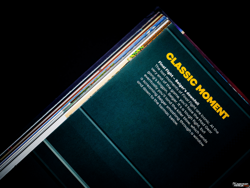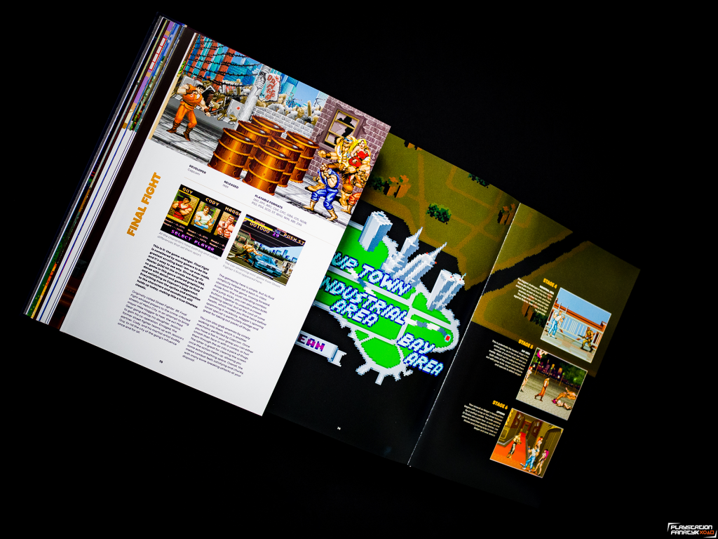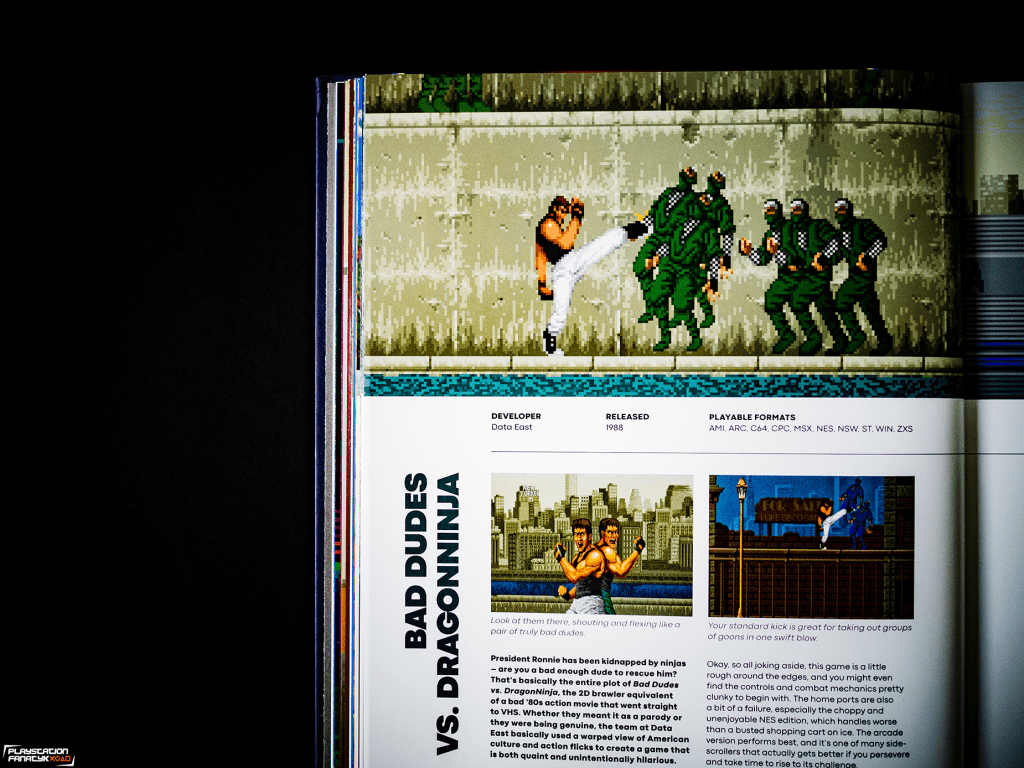 Opisy gier to nie biedne „kopiuj-wklej” z Wikipedii (praktycznie każda z opisanych produkcji przedstawiona jest na osobnej stronie), a pełne smaczków i ciekawostek przedstawienie każdej z produkcji (Ktoś z Was wiedział, że Cadillacs and Dinosaurs doczekało się własnej, 13-odcinkowej animacji? Albo, że Kung-Fu Master zostało stworzone na licencji filmu Meals on Wheels z Jackie Chanem?). Dodatkowo, co kilka stron dostajemy „rozszerzenie” w postaci bonusowych materiałów z gry na rozkładanych kartkach, jak np. opisy przeciwników z Altered Beast czy mapka z przedstawiająca poziomy z Final Fight; przerywniki w postaci „klasycznych momentów”, które zapewne część z Was będzie kojarzyć (jak zobaczyłem ekran końcowy Bad Dudes Vs. DragonNinja to uśmiech nie schodził mi z ust przez kolejne kilka minut). Wszystko to okraszone jest garścią świetnie zreprodukowanych screenshootów — nie będzie żadnym nadużyciem, jeśli stwierdzę wprost, że autor nie poszedł na łatwiznę!