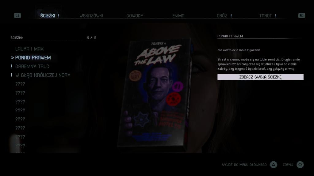 Mechanika gry to rozwinięcie dobrze już znanego z poprzednich projektów SMG, horroru/thirllera w formie filmu interaktywnego, w którym rzuca się naszych bohaterów w mniejsze/większe lokacje, pozwala nieco po-eksplorować i zmusza nas do podjęcia kolejnych decyzji, z których dosłownie każda może mieć kolosalne znaczenie w kolejnych rozdziałach historii. „Wybór ścieżki” jest jasno komunikowany przez efekty rodem z taśm VHS i tak jak wcześniej tu też możemy podejrzeć w menu streszczenie naszych wyborów. Oczywiście, żeby nie było tak idealnie, to oczywiście są również momenty gdzie kontrola nad wydarzeniami jest tylko iluzoryczna i niezależnie do tego co powiemy lub zrobimy, gra potoczy się tak, jak zaplanowali to jej twórcy, ale nie jest to aż tak uderzające jak w innych grach reklamujących się mechanikami opartymi na „efekcie motyla”. Podczas eksploracji, przyjdzie nam odkrywać kolejne poszlaki, rzucające nieco światła na miejsce i sytuację, w której przyszło się nam znaleźć, a także karty tarota pokazujące fragment przyszłości, przydatne w oszukaniu przeznaczenia. Klimat gry na tyle dobrze buduje napięcie, że nie raz złapałem się na tym, że nie byłem do końca przekonany czy chcę przeszukiwać dane miejsce, gdyż nie wiadomo było czy za chwilę nie znajdę w sytuacji, która dla aktualnego bohatera może okazać się tą z serii „być albo nie być”