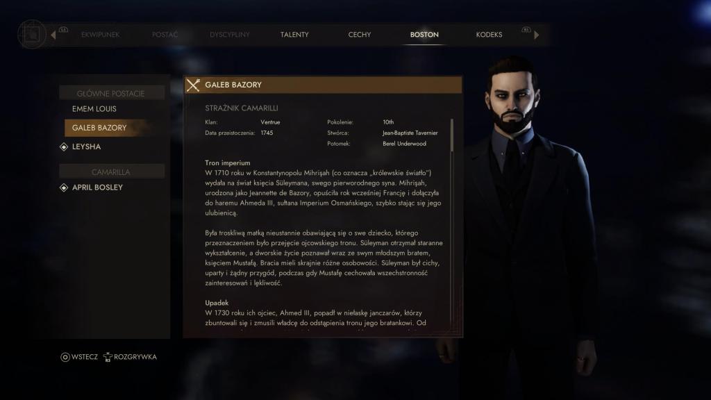 Historia umiejscowiona jest w Bostonie, czasów teraźniejszych, gdzie pośród śmiertelników, funkcjonują grupy wampirów, podzielne na swego rodzaju klany/frakcje. Nie wchodząc w szczegóły, istniejące grupy koegzystują obok siebie, choć raczej trudno mówić tu o jakieś wielkiej miłości do „bliźniego”. Jednak aby nie dopuścić do powtórki z historii, poczynione zostały ruchy w kierunku taktycznego sojuszu, co przypieczętowane miało zostać podczas przyjęcia, wydanego przez Dwór księcia Camarilli… Cóż jak się już pewnie możecie domyśleć, nie wszystko poszło zgodnie z planem, co doprowadziło do ogłoszenia alarmu w całej wampirzej społeczności. Tu zaczyna się nasza właściwa przygoda, gdzie jako troje wampirzych sług w postaci buntowniczej Emem; wiernego Galeba siejącego postrach wśród wrogów dworu; udręczonej przez wizje i koszmary Leyshe, będziemy musieli dowiedzieć się, co tak naprawdę stało się na przyjęciu, jakie mogą być potencjalne konsekwencje tych wydarzeń dla pozostałych oraz jak nie dopuścić do najgorszego. Muszę przyznać, że od samego początku, historia jak i przedstawione postacie przykuwają uwagę, niczym dobry scenariusz sesji RPG (ale to chyba nic dziwnego, skoro gra na takowym właśnie bazuje). Choć sam wątek główny może być dla wielu dość przewidywalny to zagłębienie się w wykreowany świat i historie napotkanych postaci skutecznie to rekompensuje.