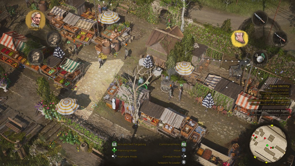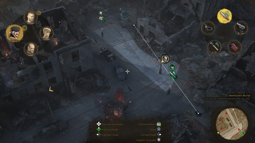 Co do samej rozgrywki to mamy tu klasyczną, izometryczną, strategię taktyczną z elementami skradanki, gdzie otrzymujemy ograniczony liczbowo oddział, którego umiejętności mają nam posłużyć do wykonania konkretnego zadania, tak aby nie zostać wykrytym (z tym ostatnim to tak nie do końca, ale o tym za chwilę). Jeśli graliście we wspomniane już wcześniej gry z serii Commandos, to będziecie się tu czuli jak w domu — konieczność taktycznego planowania ruchów, bohaterowie z odrębnym zestawem skili, możliwość podejrzenia pola widzenia przeciwnika, wabienie wrogów, skradanie się i walka po cichu, jak i na Rambo. No po prostu klasyka gatunku. Jest natomiast jedna mechanika, której nie pamiętam z „pierwowzoru” (jeśli się mylę, to poprawcie mnie proszę w komentarzach), mianowicie tryb planowania, gdzie możemy pierw zaplanować całą akcję z zadaniami dla naszych poszczególnych bohaterów, a potem ją po prostu odpalić i patrzeć na efekt, co przydaje się podczas eliminowania większych grup wrogich żołnierzy, których nie da się podejść po kolei czy pozbawić tchu np. zrzucając na nich luźne cegły z pobliskiego budynku. Wspomniałem też o tym, że nie zawsze trzeba wybierać bycie niezauważonym, do czego możemy wykorzystać tryb bojowy, który diametralnie zmienia nam schemat sterowania, gdzie bardziej przypomina to twin shootera niż strategię — lider, którym sterujemy, celuje i poniekąd wskazuje pozostałym kierunek ataku.