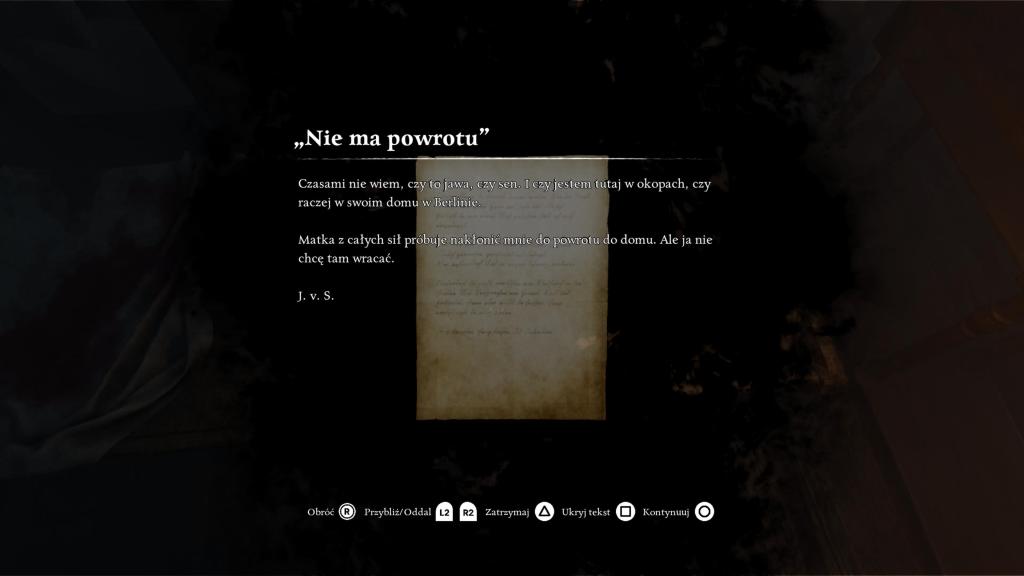 Powyższe wyjaśnienia znaczenia tytułu gry przytoczyłem nie bez powodu, gdyż jest ono trafnym odzwierciedleniem tego, co dzieje się z bohaterem, w którego buty przyjdzie nam wejść na najbliższe kilka godzin. Paul Von Schmitt to niemiecki żołnierz, który zmaga się z nawracającą traumą spowodowaną życiem w okopach na froncie I Wojny Światowej, jak i sytuacją rodzinną (bo trzeba wspomnieć, że Von Schmittowie to mocno specyficzna rodzina, ale pozwólcie, że nie będę się o tym rozwodził nic ponadto bo zaspoilerowałbym Wam sporo). Historia w grze toczy się niejako na dwóch przecinających się drogach — w zasadzie nie do końca wiadomo, który z dwóch przedstawionych światów jest wizją z przeszłości — gdyż dom Von Schmitt’ów jest pełen wspomnień i przeróżnych tajemnic, których odkrywanie nie tylko rzuca nieco światła na to, jacy byli poszczególni członkowie rodziny, ale również tłumaczy częściowo to, co widujemy po drugiej stronie lustra, na froncie Wielkiej Wojny.
