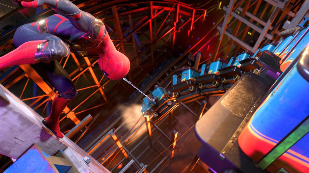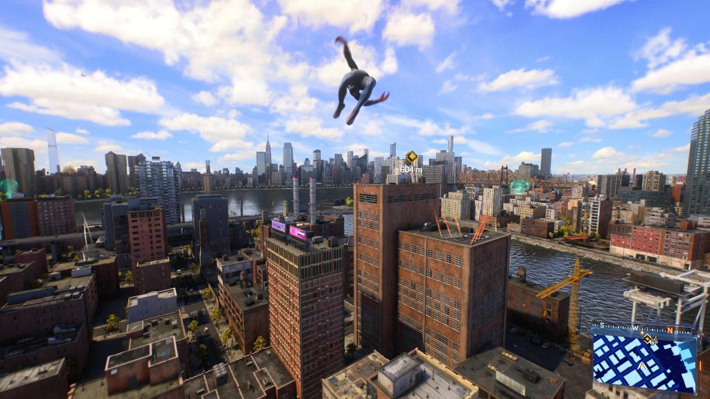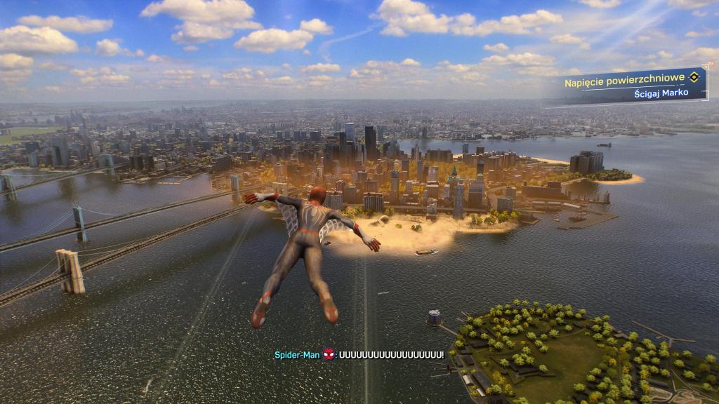 Moc, jaką oferuje PlayStation 5, widać też choćby w postaci płynnych, „szybkich” podróży — po wykonaniu odpowiedniej ilości aktywności w danej dzielnicy, możemy przenosić się z miejsca na miejsce w ułamku sekundy, co jakby nie było robi wrażenie (i tak widziałem już opinie, że „olaboga w Ghost of Tsushima było lepiej, szybciej”, ale naprawdę to już jak dla mnie czepianie się totalnie na siłę..), jednak sam nie korzystałem z tego zbyt często — choć fakt dodania Brooklynu i Queens do obszarów, jakie możemy odwiedzić i tym samym znaczące powiększenie mapy jak najbardziej mogłyby ku temu skłaniać — bo sporo frajdy sprawiało mi poruszanie się na pajęczynie czy nowych „Siecio-skrzydłach”, które urozmaicają nieco opcje przemieszczania się po mieście (a nawet wiąże się z nimi jedna z serii aktywności pobocznych).