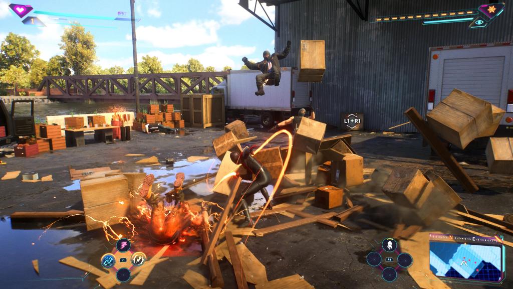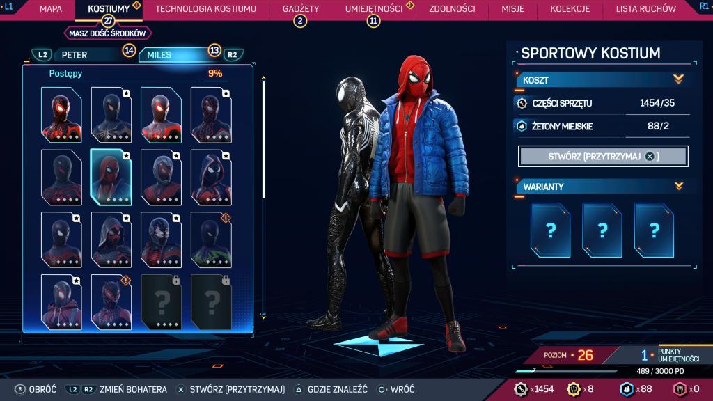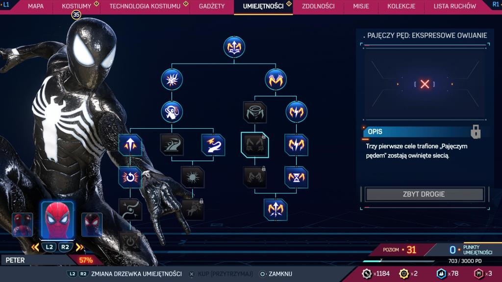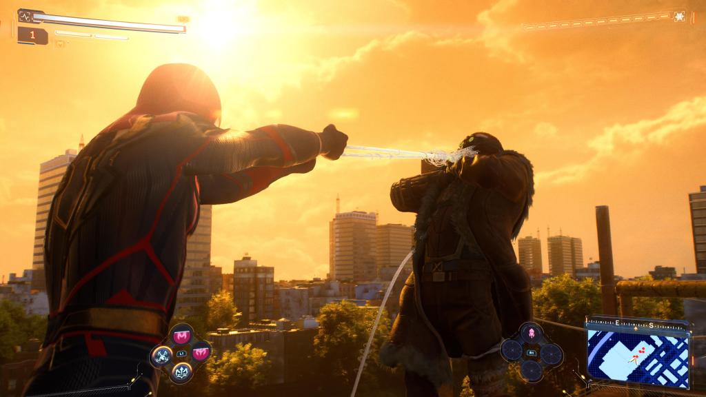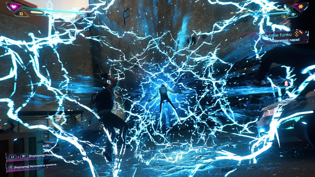 Ok, skoro tło dla obijania kolejnych mord mamy już nakreślone, to przejdźmy zatem do tego, co faktycznie nam to umożliwia. Tu pozwolę sobie na mały skok w przeszłość, bo jeśli dobrze pamiętam, to porównując Milesa Morales’a do wcześniejszej odsłony, chwaliłem nowe moce Pająka, i tu sytuacja ma się podobnie. Twórcy postanowili rozwinąć to, co zaserwowano nam wcześniej i w zasadzie przenieśli 1:1 system walki, oparty na unikach, strzelaniu siecią, seriach ciosów, żonglowaniem przeciwnikami w powietrzu, gadżetach i umiejętnościach specjalnych, rozwijając przy tym nieco każdy z tych aspektów — Peter i Miles otrzymali swoje własne (oraz jedno wspólne) drzewka rozwoju (ale spokojnie, mimo trzech drzewek nie ma tu mowy o konieczności nieskończonego grindu, gdyż same zadania fabularne i co większe poboczne, zapewniają wystarczającą ilość doświadczenia) czy zestaw umiejętności, który możemy modyfikować pod siebie i swój styl walki — dodając też nieco opcji dla tych, którzy mimo wszystko wolą nie wchodzić z buta jak Rambo, tylko metodycznie i po cichu eliminować zagrożenie. Z tą drugim podejściem wiąże coś jeszcze, mianowicie w jedynce nieco narzekałem na momenty gdzie przychodzi nam posterować przez chwilę wybranką Petera, jednak tutaj sekwencje te uległy poprawie, dzięki czemu gra zyskała kilka skradankowych momentów, w których mamy możliwość wyeliminowania kilku koksów.