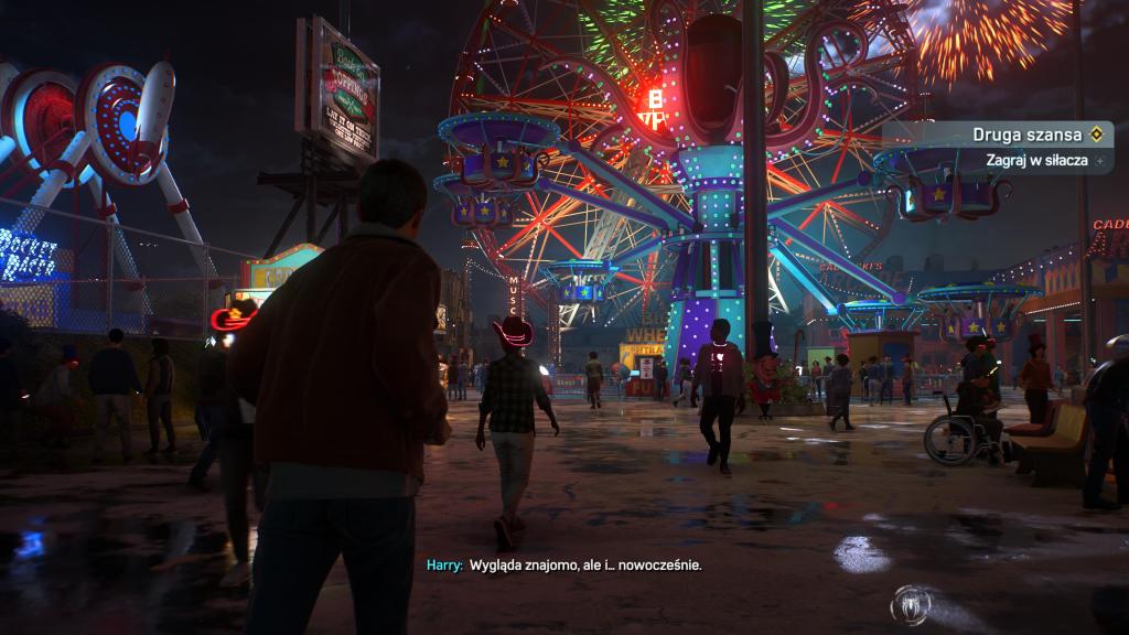 Scenarzyści rozpisali wątek fabularny na jakieś ~15 godzin i choć po premierze widziałem na necie sporo negatywnych komentarzy na temat długości gry, to moim zdaniem jest to bardzo przyzwoity wynik, a w tym wszystkim, nie można zapomnieć, że gry z otwartym światem stoją nie tyle samą fabułą, a tym, co poza nią — no i tutaj dopiero zaczyna bić licznik. Dodatkowo po zakończeniu przygody, odblokowuje się najwyższy poziom trudności, co pewnie dla części z Was może stanowić kolejny plus i wyzwanie. Do naszej dyspozycji oddano zgłoszenia od obywateli, losowe działania przestępców w mieście, odrębne aktywności dla każdego ze Spider-Man’ów czy dłuższe misje poboczne, z własną historią, które warto poznać (nie chcę tu niczego spoilerować, więc powiem tylko, że jest jeden wątek co najmniej warty sprawdzenia, gdyż może rozbudzić pewne spekulacje). Dodatkowo podobnie zresztą jak wcześniej, potrafiłem po prostu bujać się na pajęczynie po mieście kompletnie bez celu, robiąc salta i próbując wykręcić jakieś inne akrobacje, a wszystko to z ogromną radością na twarzy.
