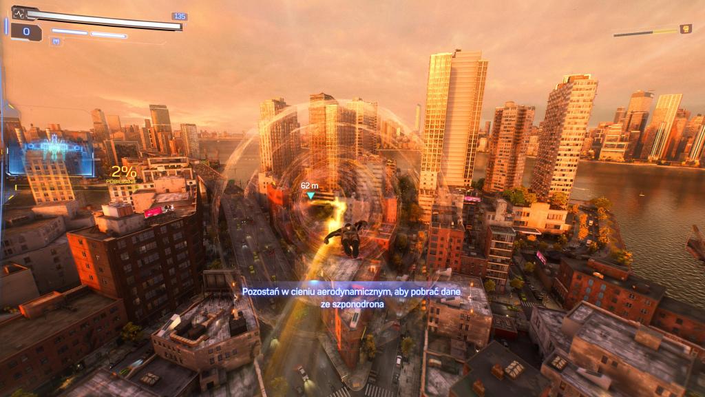Przez 99.99% czasu grałem w trybie wydajności, zapewniającym mniej więcej 60 FPS’ów oraz częściowy Ray-Tracing, a tryb jakości włączyłem w zasadzie jedynie z kronikarskiego obowiązku, potwierdzając tylko, że jestem zbyt ślepy, żeby zauważyć jakąś znaczącą różnicę w grafice, która by usprawiedliwiła obniżenie płynności rozgrywki (opcjonalnie możecie odpalić też 120FPS i VRR o ile posiadacie ku temu odpowiedni telewizor/monitor). Niezależnie o tego, jaki tryb wybierzecie, Spider-Man i Nowy Jork robią świetne wrażenie, a sam gameplay potrafi wręcz zachwycić swoją widowiskowością (wspominałem już o uderzeniu w prologu??).