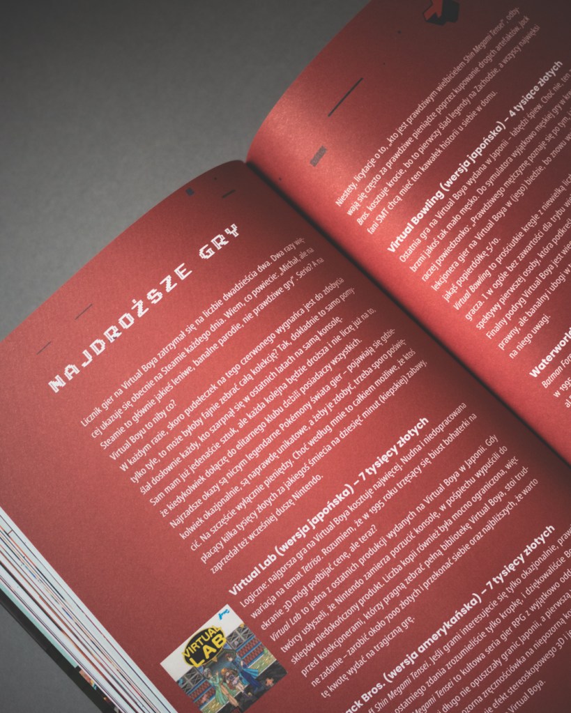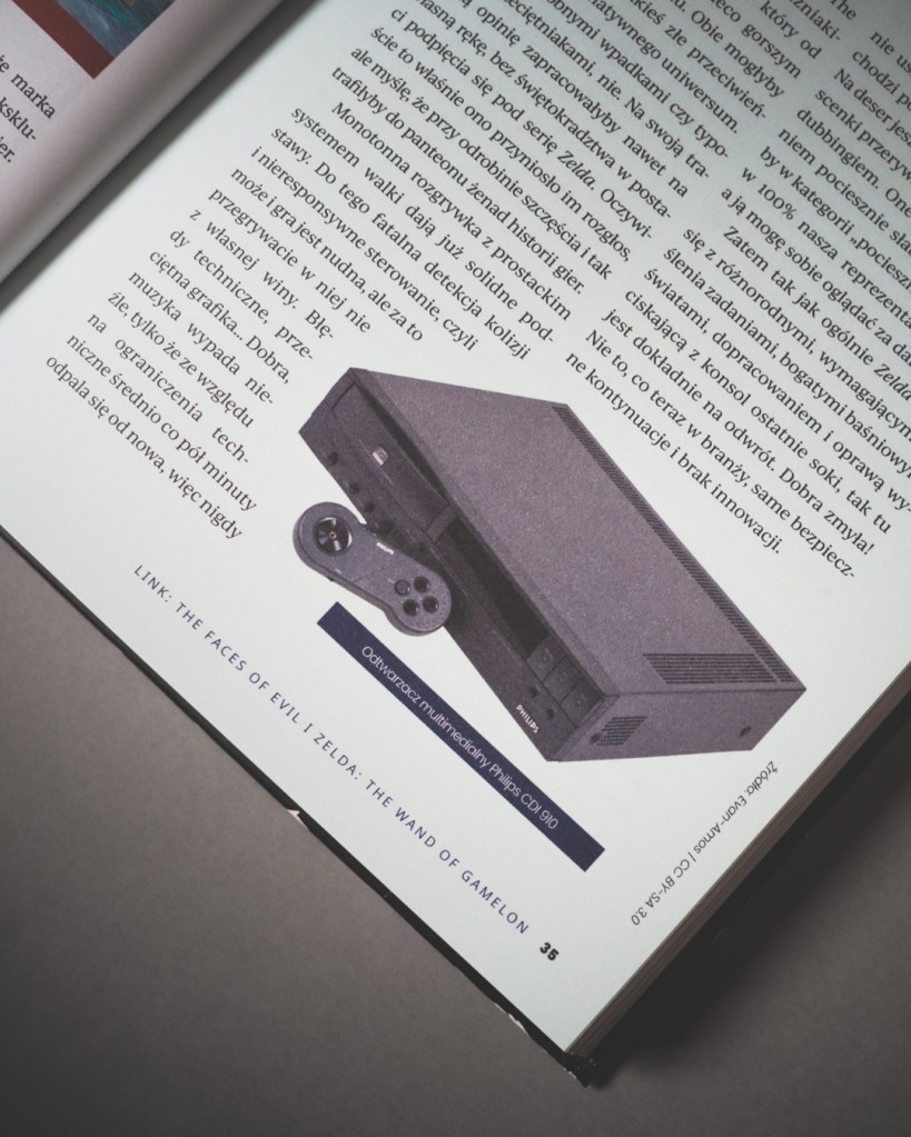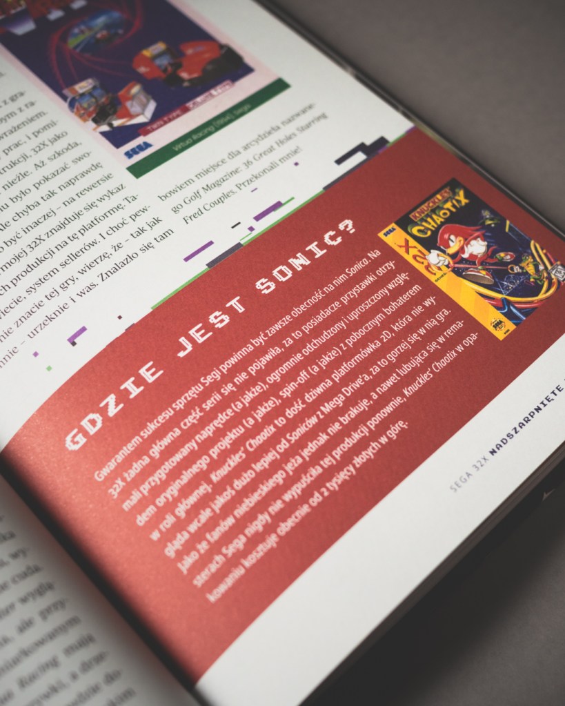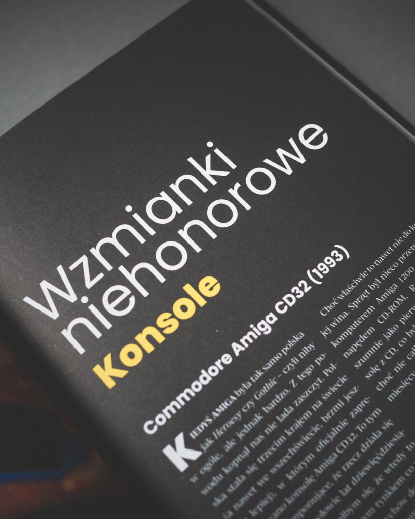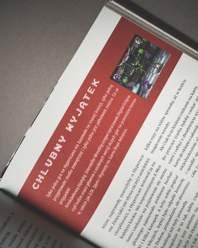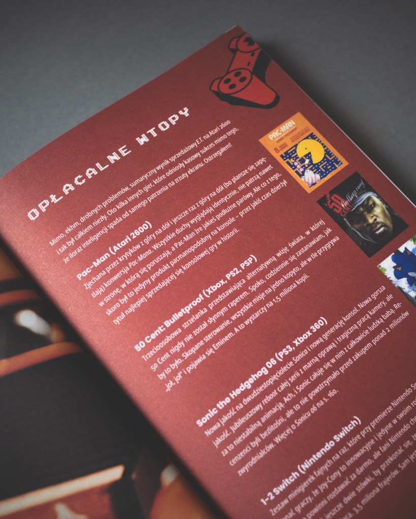 Na początku miałem jeden, drobny problem, mianowicie układ tekstu — książka podzielona jest na dwie kolumny, trochę jak w magazynach, co początkowo nieco wybijało mnie z dłuższego czytania. Po wstępie, który był jeszcze klasycznym, jednoszpaltowym tekstem, przechodzimy w dwukolumnowy układ i tak już w zasadzie zostaje. Na starcie było to dla mnie nieco dziwne, ale też szybko się przyzwyczaiłem. Z drugiej strony — rozumiem dlaczego — jest tu naprawdę dużo ilustracji, zdjęć konsol, screenów, materiałów, które urozmaicają lekturę, a dla kogoś, kto tak jak ja jest wzrokowcem, to duży plus. Ogólnie wydanie robi naprawdę dobre wrażenie — twarda oprawa, dobry papier i jakość druku oraz trafiony w punkt projekt okładki z imitacjami zużycia, nawiązującymi do zezłomowanych gwiazd, które opisuje (tu ukłony dla Pana Sebastiana Komorowskiego, odpowiedzialnego za projekty grafik).